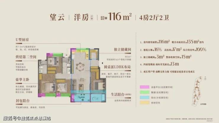 户型设计是非常主流的布局,四开间朝南,南向采光面达约13米,客厅面宽约6.9米面,U型中厨 + 西厨岛台规划,能轻松容纳 1.5米大圆桌(同面积段产品通常只能放方桌),家庭聚餐氛围拉满。南向双阳台分流:景观阳台(未来可封包拓展为茶室/健身房/书房) + 生活阳台(保证南向晾晒功能),互不干扰。