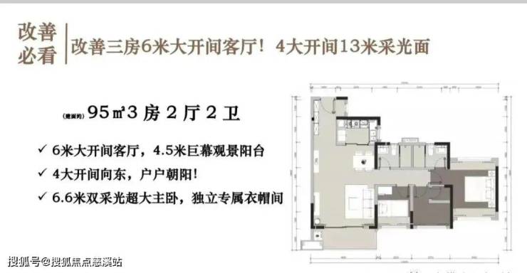 95平三房两厅两卫,95平的户型与86平大致相同,同样采用竖厅设计,餐厅、客厅和阳台连通。