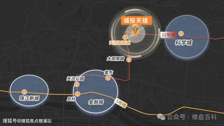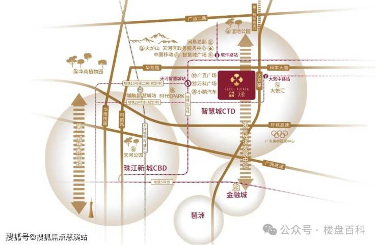 位于广州市天河区华观路和大观中路交汇处,广州地铁21号线天河智慧城站附近;坐落天河智慧城CTD,广州第三经济发展中轴核芯,与珠江新城CBD共同构成“一区双核”的发展格局,将成为广州新的经济增长极。
