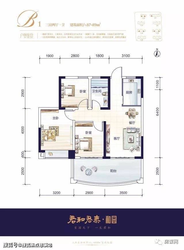 B1户型,三房两厅一卫,建面约87-89㎡。