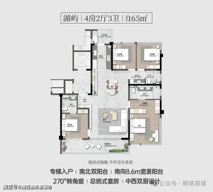 项目整体户型方正,长开间短近深,南北通透,拥有独立的电梯厅,私密性好,带大开间阳台或转角阳台,尺度较舒适。