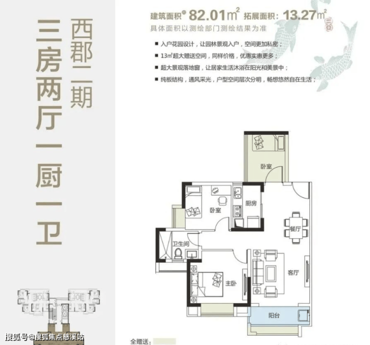 82㎡(3房2厅1厨1卫),赠送13㎡;