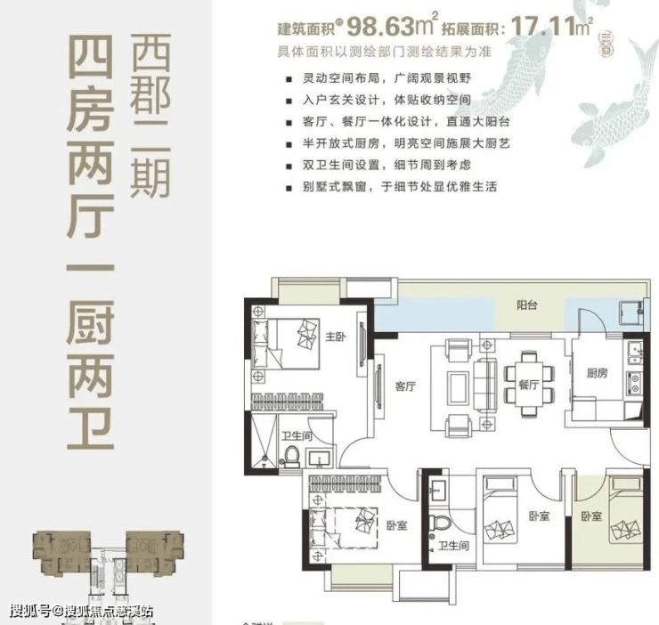 罕见99m2四房,可拓展面积17m2,使用面积116m2,4房+2厅+2卫,突破传统,傲视全城。