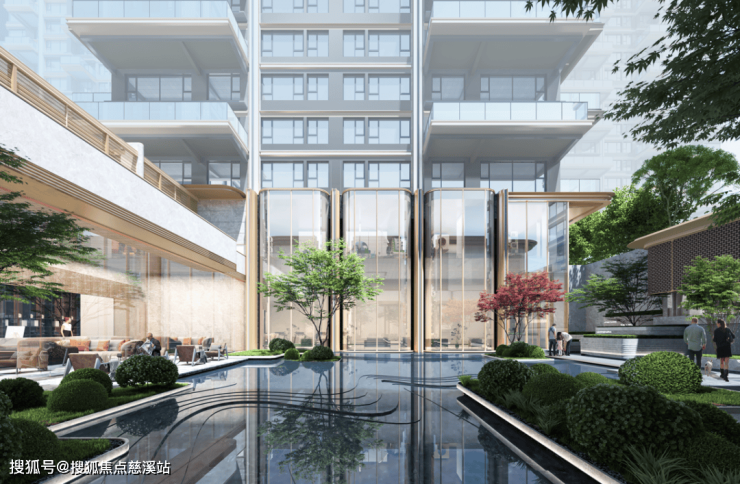 南侧主入口打造约150米“超级界面”,精心塑造具有强烈昭示性的城市建筑群像,借水景和艺术装置与镜水面,营造泉源意境,既彰显了社区不言而喻的品质感,也成为区域焕新升级的视觉标志。