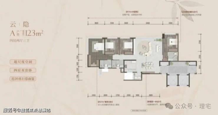 四房三卫双主卧套房设计,兼顾代际隐私与家庭互动。