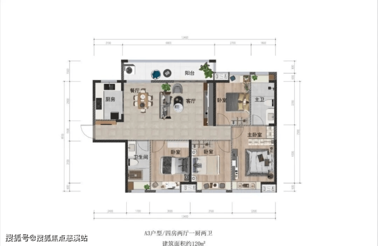 主力户型:(建面约) 120m²四房两厅两卫。