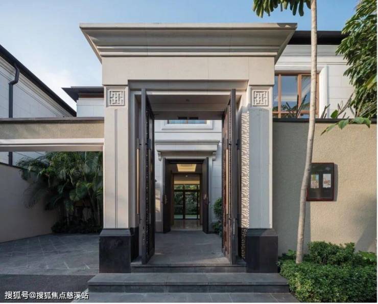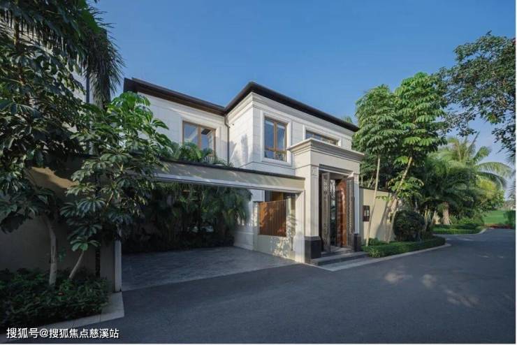 海棠潮鸣别墅统一采用二层造型,形体比例舒适宜人,墙面以仿石涂料为主,突出的门头位置采用葡米石材,主体以均衡的虚实比例及考究的细部线条营造价值感。屋顶采用仿柚木铝合金的深远挑檐及平坡结合的方式,打造热带风情和度假氛围。
