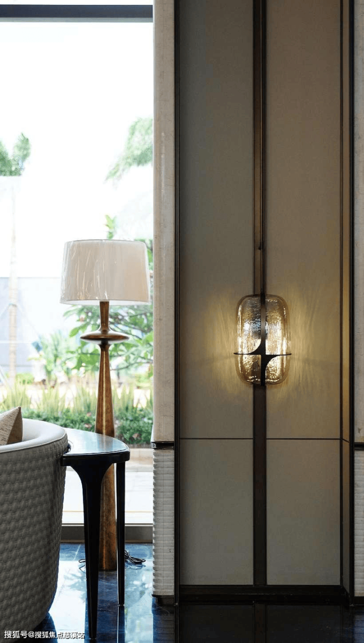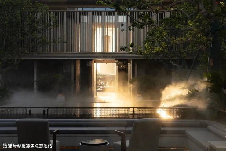 穿过大堂,步入园林,一场沉浸式的松弛度假之旅正式展开。约147米风雨连廊,24小时光幕温柔守护,晴雨皆成景致。动线串联400㎡下沉星光水院,叠级水景与龙鳞纹底板暗合“龙口衔财”吉祥寓意,潺潺流水声更似天然白噪音,轻抚心境。水院中的“星海岛屿”汲取新加坡W酒店设计灵感,与聆星会客厅无缝衔接,共同构筑社区中央的社交主场。