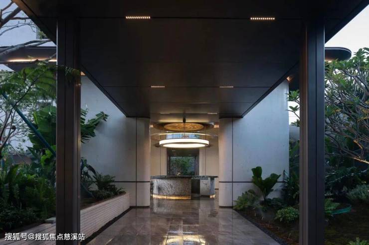 约368㎡泛星门庭,对标五星级酒店落客标准。珍稀植物沿弧形动线舒展,爱马仕灰仿石砖与香槟铝板经弧形切面工艺,碰撞出高级质感。“四水归堂”现代设计,顶部定制铝板复刻传统坡顶形制,寓意“聚财守业”;中庭“华之心”雕塑,采用安哥拉黑整石定制工艺,以流畅弧面诠释匠心底蕴,让归家首重仪制满载尊崇。