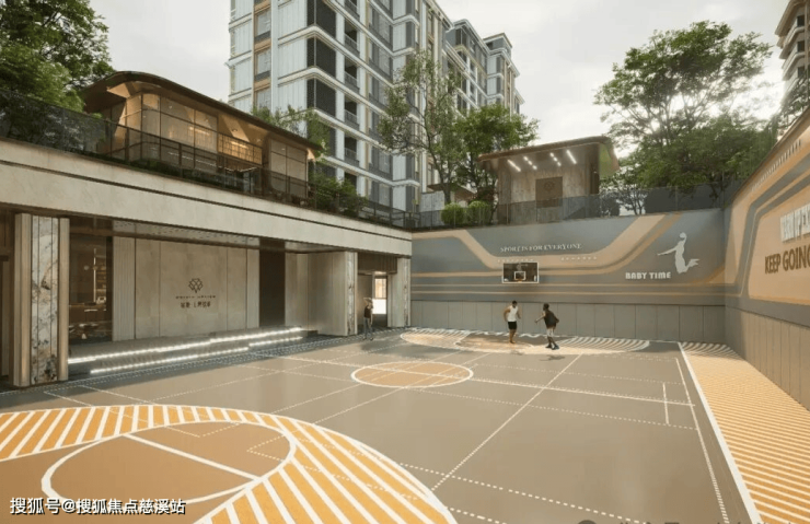 🏀 下沉式运动场,篮球、羽毛球、排球三合一,与全龄健身花园交织,动静分区,满足家庭多元运动需求,赋予生活鲜活的松弛感。