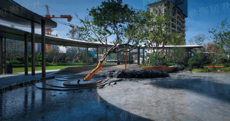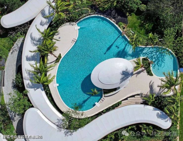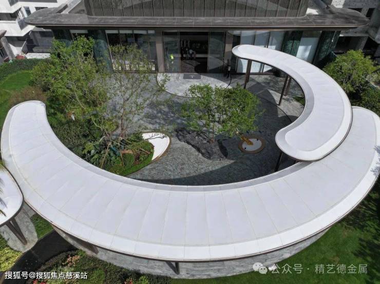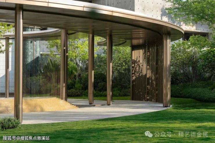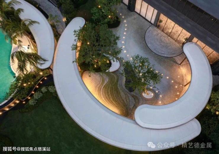点睛之笔的曲线风雨连廊系统。通常只有非常注重品质的项目,才会在园林景观中打造风雨连廊,但多数项目仅采用直线形制,毕竟曲线造型需突破施工精度与成本控制的双重瓶颈。