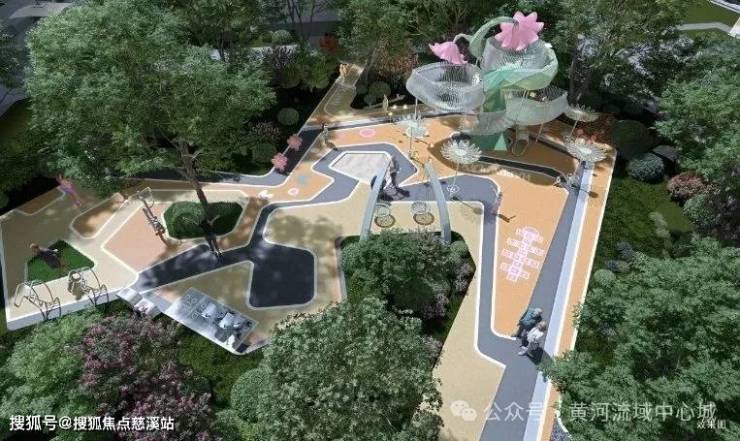 内外双公园体系交织全龄生活场景:社区内嵌"三轴两环多节点"四季园林,外接中央绿谷公园与黄河生态廊道。