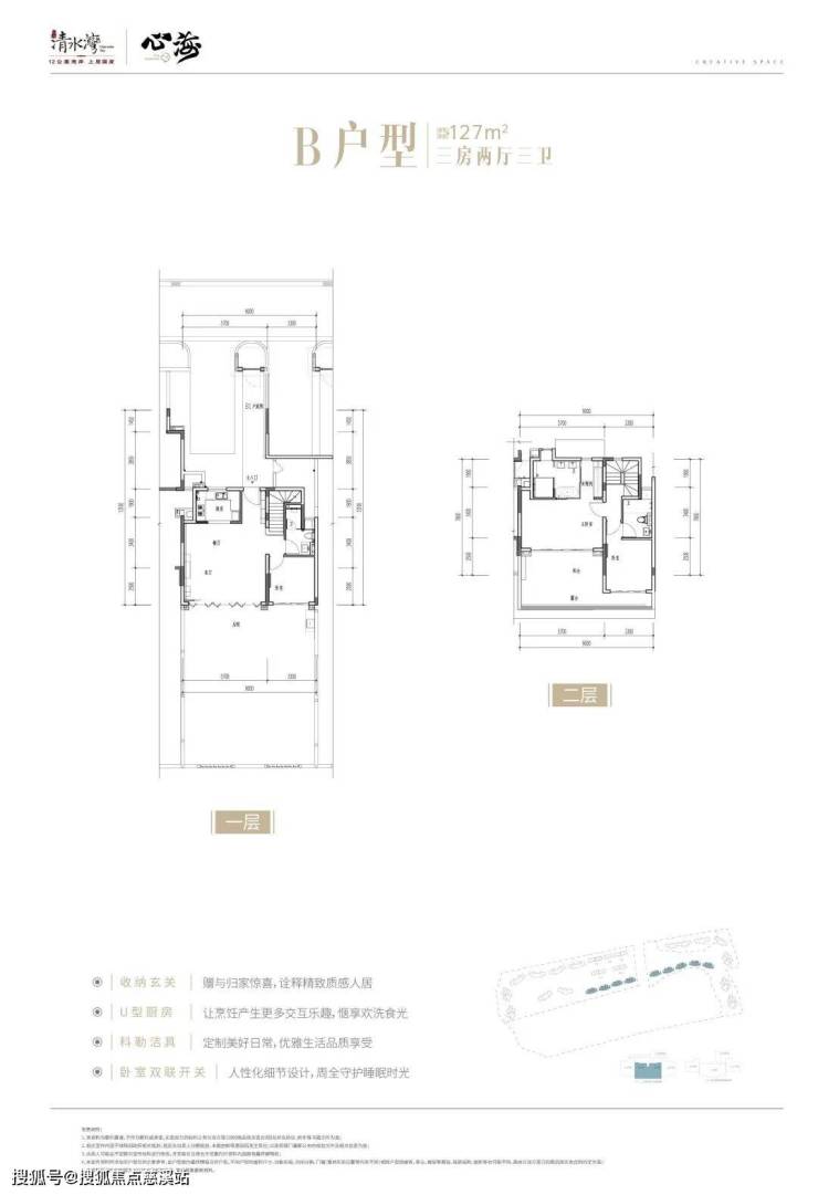 叠拼产品B户型:建筑面积约127㎡,三房两厅三卫