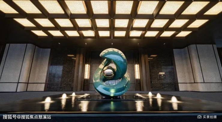 入口处整面运用巴西天然铂金钻奢石,铂金色彩如泉水般流淌,深邃璀璨,与礼序金属大门交相辉映。中心雕塑水景以安哥拉黑石材为基,托举“泉城明珠”艺术雕塑,寓意引泉踏水而归。
