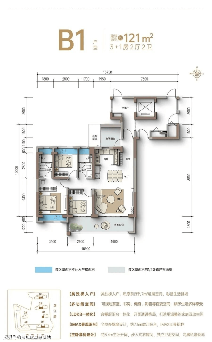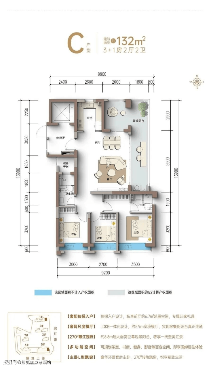 高端配置:2梯3户纯板楼,独梯入户,私享约6.7-11㎡电梯前厅;LDKB一体化空间,全屋飘窗/阳台。