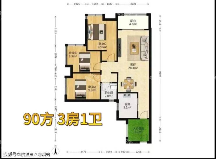 01.02户型 100方 南向三房两卫