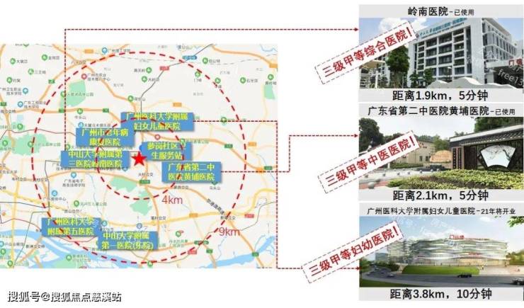 •医疗:5公里范围拥有 3 家三甲医院,分别为广医妇女儿童医院、省第二中医院黄埔医院,5 分钟路程可达黄埔最大最权威的三甲医院:中山大学附属第三医院•岭南院区。