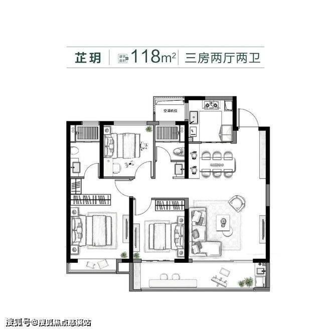 建面约118㎡户型:3房2厅2卫户型方正,南向大开间双阳台,采光和通风充足,主卧套房设计,全景飘窗,关于“舒适”的关键词,这款户型均具备,且在面积段上介乎于约97㎡三房与约138㎡四房之间。