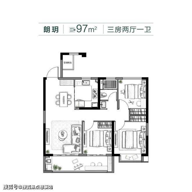 建面约97㎡户型:3房2厅1卫设计,户型方正,三开间朝南,尤其是居室的尺度感让人惊叹,南向采光面直接达到约9.6米,跑道式双阳台面宽约6.4米,再加上客餐厅一体,格局开阔,动线清晰等优势,成为不少初次置业和改善家庭的必选户型。