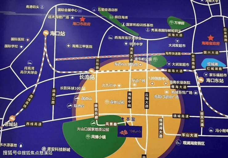 “月明山庄”位于海口的中南部,属海口市秀英区管辖,占地82亩,绿化率高达60%,容积率仅0.35%,由66栋双拼别墅组成,共132套,停车位270多个,每户基本配备2个停车位。项目到国家4A级景区石山火山石地质公园仅3公里路,开车4分钟就可到达,距离石山镇最大的农贸菜市场6公里,石山镇有银行、超市,可基本满足生活所需。项目西面和南面全是生态保护区,这里土壤和水质含有丰富的微量元素,周边森林覆盖面积大,空气含氧量高,特别适合居住和养生。项目东面紧挨观澜湖片区,有观澜湖度假区,冯小刚电影公社,还有12个高尔球场。项目北面,走海榆中线6.7公里路可到万达广场和北大附中附小,开车仅需10分钟车程。3~4分钟可到绕城高速,绕城高速有多个出入口进出海口,开车20分钟可到海口市区,交通非常方便。