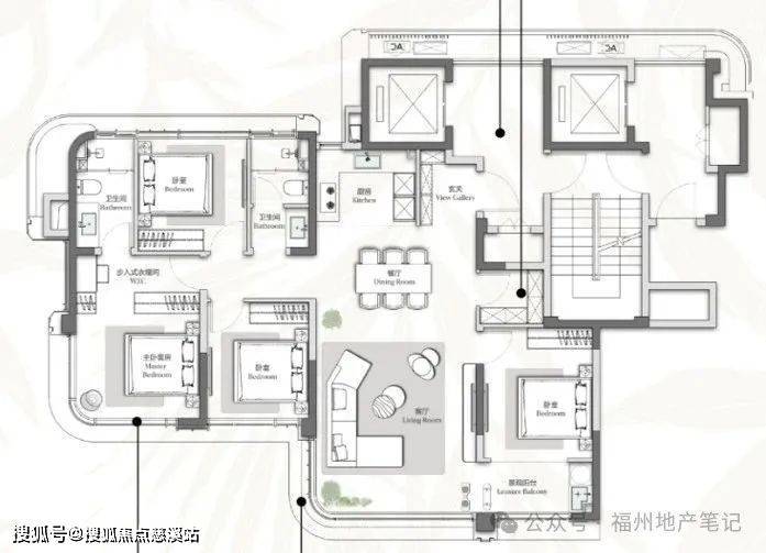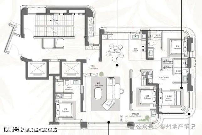38㎡主卧套、48㎡端厅,空间感还不错。主卧转角设计增加视野;但电梯厅的采光和独立性一般,设计倒挂。