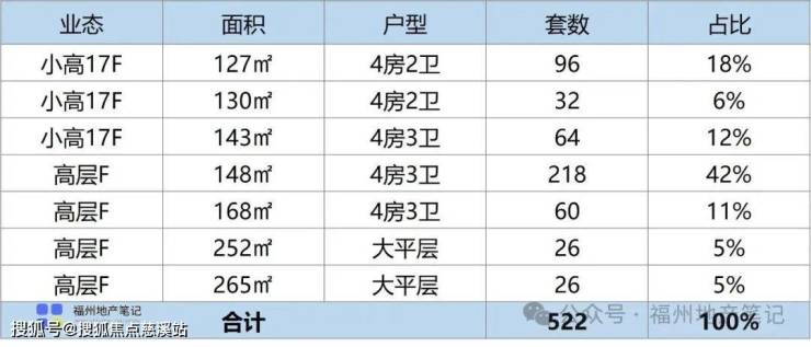 127-130㎡户型128套,143-148㎡280套,168㎡户型60套,252-265㎡户型52套。