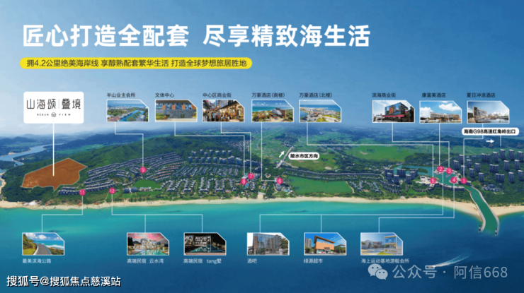 「匠心打造全配套 尽享精致海生活」· 南北万豪酒店、夏日冲浪酒店· 滨海商业街、中心区商业街· 云水湾民宿、tang墅民宿、炜航房产营地· 200亩国际游艇码头、海上运动基地、游艇会所、最美滨海公路