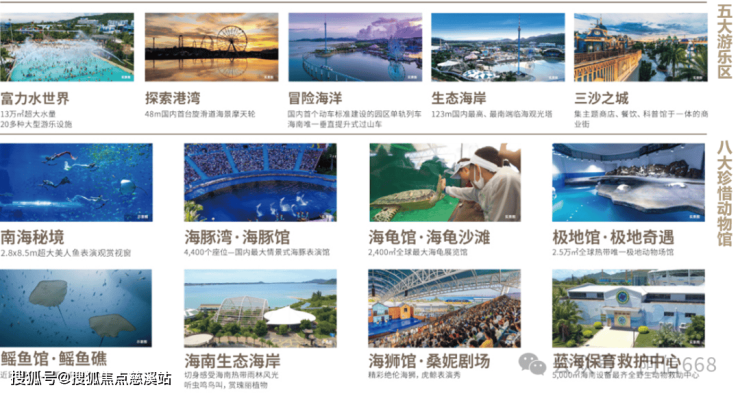 「距海南海洋欢乐世界 约15KM」· 总占地约2000亩,富力集团投资已超65亿。· 由迪斯尼策划公司——加拿大FORREC公司担纲设计、原迪士尼《狮子王》主创打造原创IP形象,分为五大游乐区、八大动物场馆及星级酒店群,拥有40多套国际顶级游乐设施,以及1500余种4万余只海洋生物。
