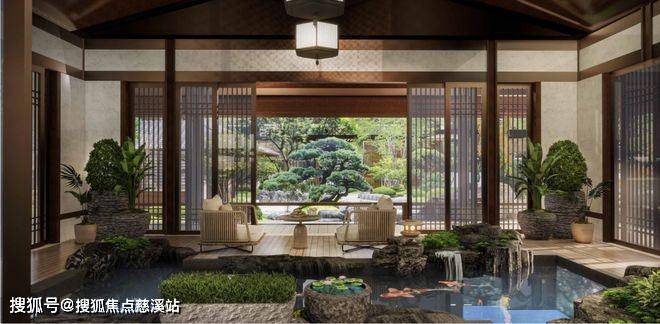 景亭内部,会开挖一处约20㎡的四方锦鲤池,四周摆放花草盆景,形成半封闭的情趣空间。