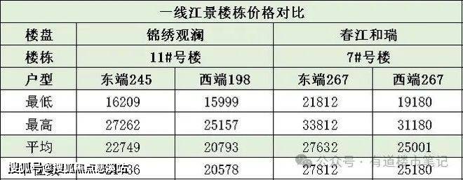 回头再看锦绣观澜一线看江楼栋11号楼东端均价22749元/㎡、西端均价20793元/㎡,是不是感觉蛮香?