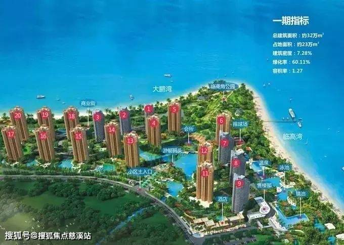 项目一期馨海组团,总占地345亩,总建筑面积32万㎡,容积率仅为1.27,绿化率高达60%,建筑密度为7%。一期共开发20栋住宅,22-28层的高层海景房。