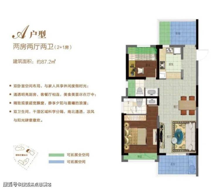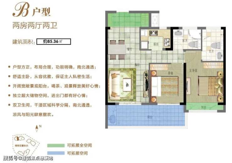 B户型:85.36㎡两房两厅两卫