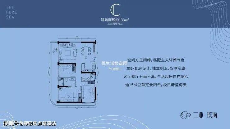 户型解析:三居室奢阔空间,海居假日自在随心;环幕阔尺双阳台,创造多维海景观感;客厅餐厅精致一体,宽阔空间随心所享;方正景观主卧,独立主卫,安享私密。