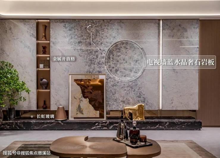 客厅背景墙则采用了意大利进口蓝水晶岩板,蓝色调和细腻纹理交织,仿若一幅绝美画卷,只一眼,就让人忍不住畅想诗和远方。