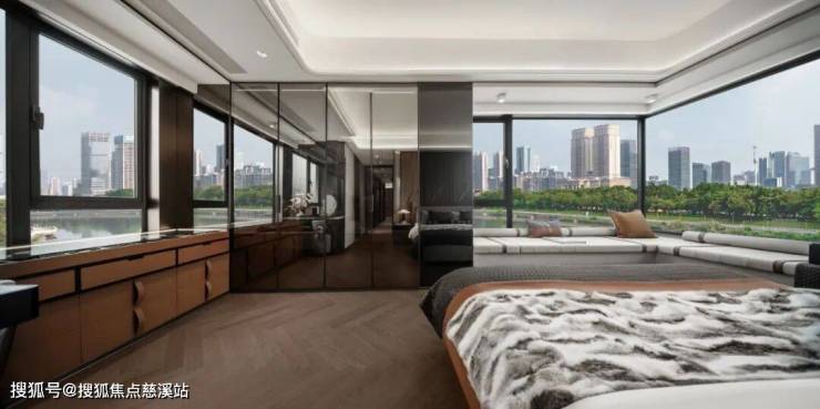 更令人尖叫的是,以星级水准打造的酒店式主卧套房,不仅配备了独立卫生间、衣帽间、化妆台,还施展出270°转角飘窗,采光取景MAX。