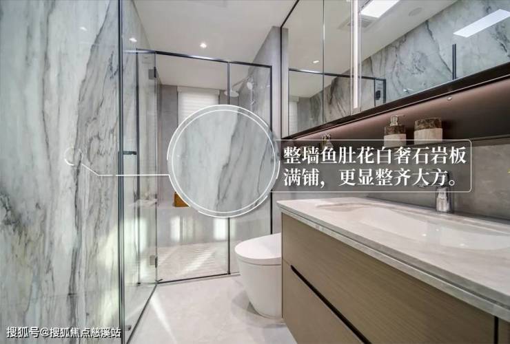主卫整面墙高达2.4米,通铺鱼肚花白奢石纹岩板,奢华而不失格调,放眼整个佛山都是相当稀贵的。