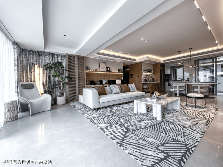虽然面积最小,但它通过客餐厅一体化+巨幕阳台 ,来打破空间局限性,获得了约50㎡的社交聚合厅。