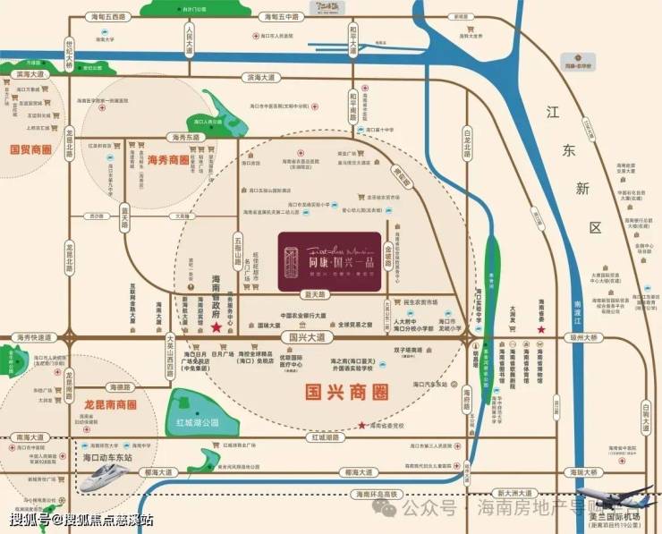 项目位于国兴商务生活圈,区域由三条城市干道(国兴大道、蓝天路、大英山西二街)及多维路网(五指山路、大英山一至五路)组成,接驳海秀快速路及两座立交桥(南大桥、海府桥)。