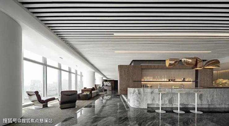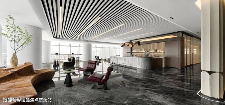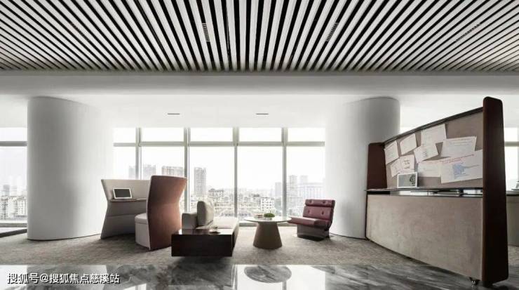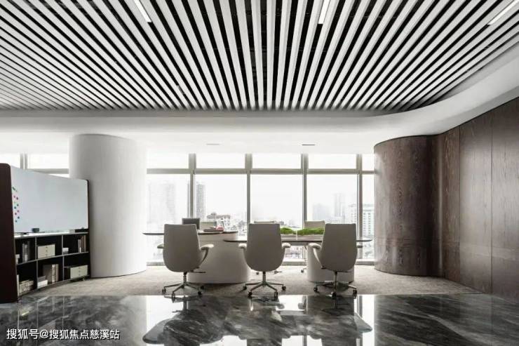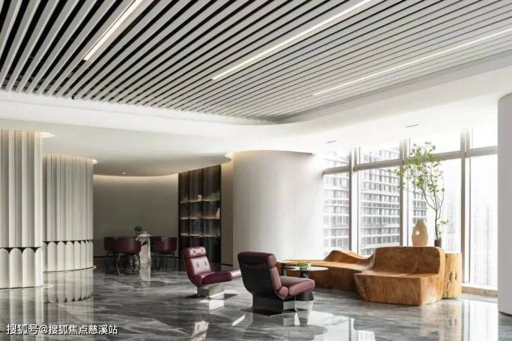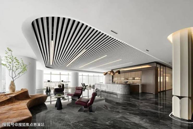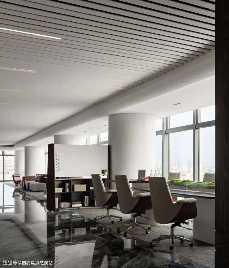 洽谈区的顶部天花将白转译为引力推开的层层水浪,流动延绵的线条仿若潮汐,海风卷动的空间氛围中,有静穆的自由向往,赋予了静态空间不一样的动态观感。