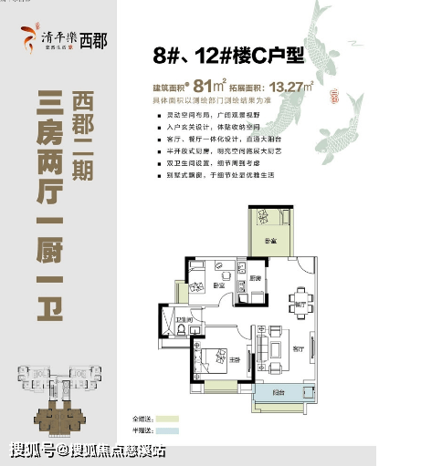 C户型 三室两厅一厨一卫 建筑面积81㎡
