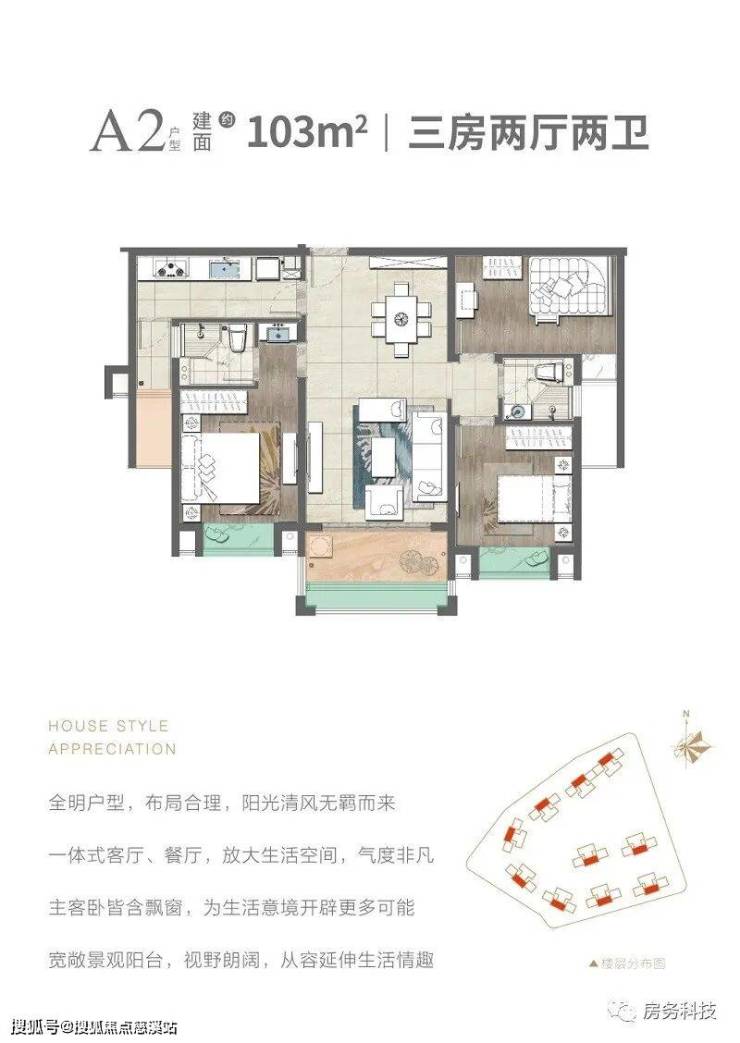 在售户型:A1户型111㎡ 3房2厅2卫、A2户型103㎡3房2厅2卫、A3户型105㎡3房2厅2卫