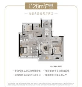 128㎡三房两厅两卫是刚需友好型户型,总价约 614 万元起,三开间朝南,客厅连接阳台,采光充足,适合刚步入改善阶段的年轻家庭。