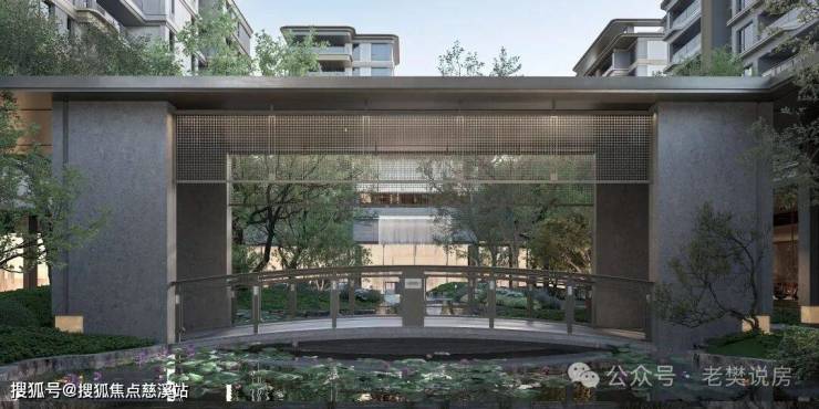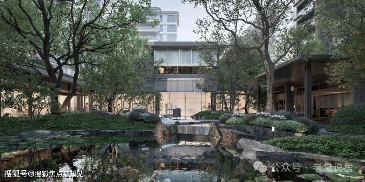 以南宋《江山秋色图》为灵感,师法《园冶》营造精粹,萃取北方青绿山水之韵与宋式文化精粹,打造宋代官帽式山门(山门整体界面底面选用蓝眼睛超规格石材,大门两侧参考上海阿丽拉酒店的高奢设计理念,以大块自然山石拼接造型)、莲桥锦鲤、水帘飞瀑、天青山房等景观空间,实现归家路径与景观节点的有机串联,以“山谷谧院·共话泉林”的生活图景,让居者沉浸式体验“上山入谷·溪畔栖居”的生活意境。