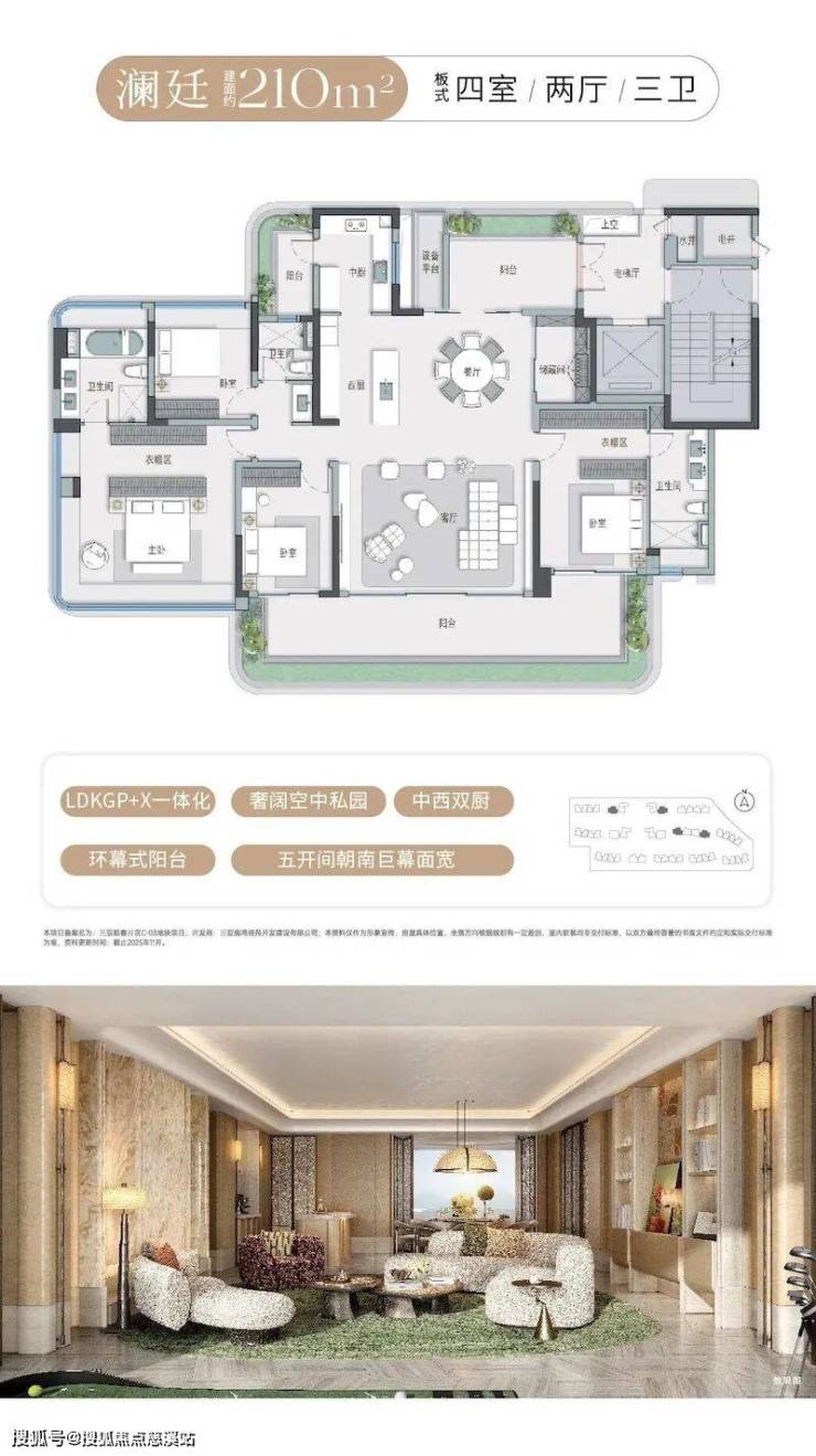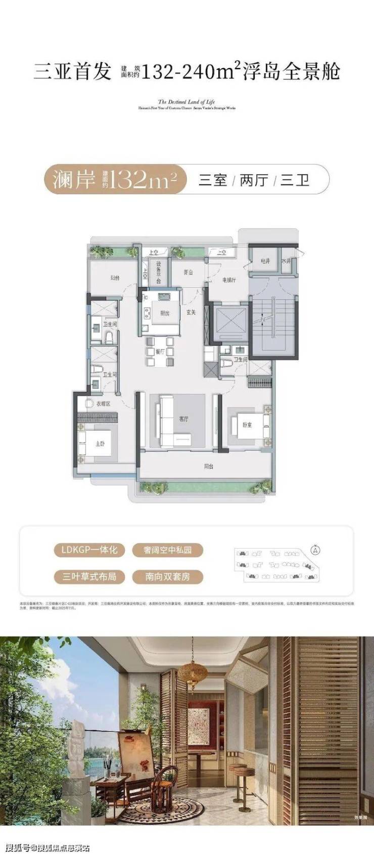 产品设计的核心亮点,当属三亚首发的“建面约132-240㎡浮岛全景舱”。这一创新设计打破了传统户型的局限,通过LDKGP一体化(客餐厨花园阳台一体化)、宽幕奢景阳台、三开间乃至五开间朝南的巨幕面宽等设计,最大化引入自然光线与景观资源。部分户型更配备270°飘窗、环幕式阳台、中西双厨等高端配置,既满足了家庭生活的功能性需求,又彰显了旅居生活的品质感。