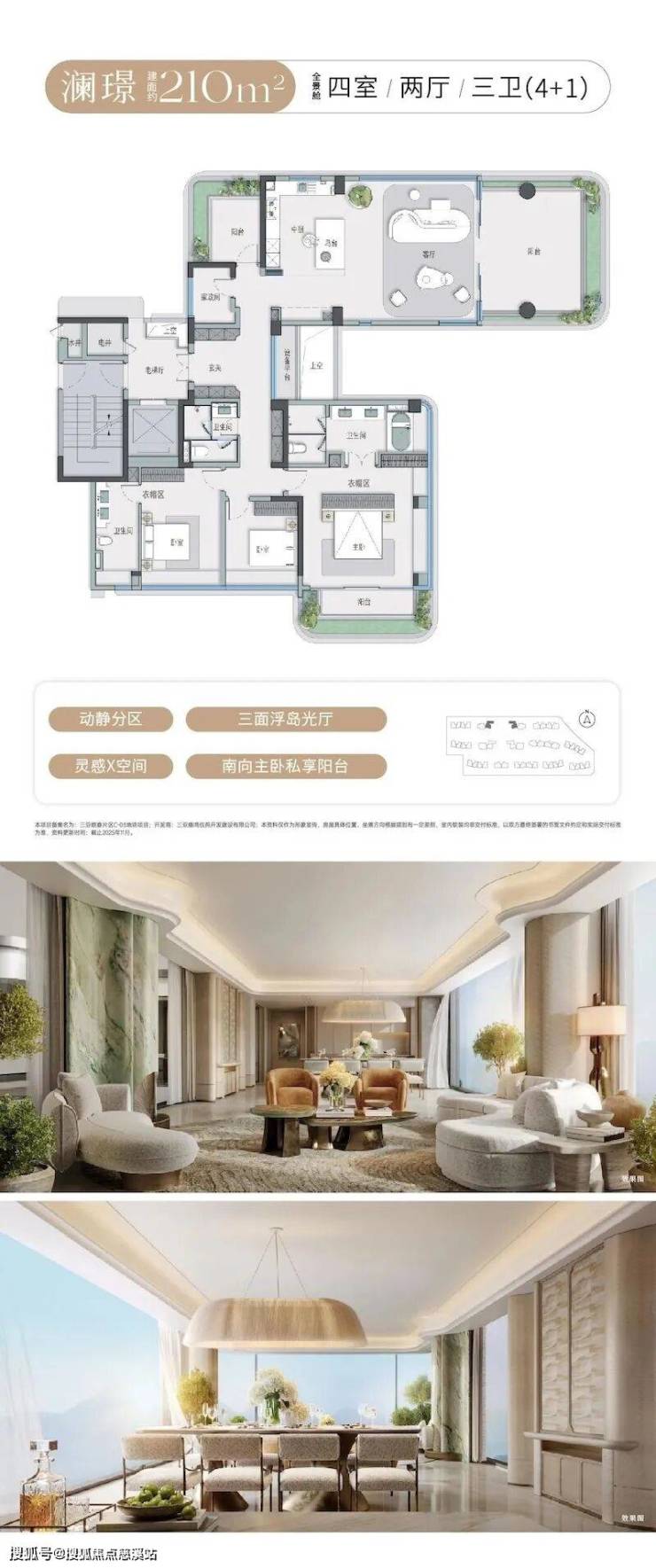 澜玥240㎡(四室两厅四卫4+1):作为项目的高端户型,配备宽境大横厅与朗阔瞰景阳台,空间尺度感十足。主卧拥有双衣帽区与私享阳台,部分户型采用三面浮岛光厅设计,让自然光线从多角度进入室内。多功能房可灵活改造,满足家庭的个性化需求,是高端旅居与长期居住的理想选择。
