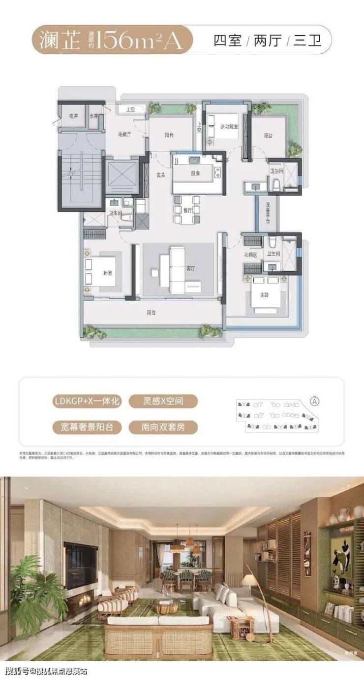 澜芷156㎡A(四室两厅三卫):创新引入LDKGP+X一体化设计,“X”灵感空间可根据需求改造为书房、儿童房或健身区,灵活性极强。宽幕奢景阳台连接客厅与卧室,最大化延伸观景视野,南向双套房配备独立卫浴与衣帽区,彰显居住品质。
