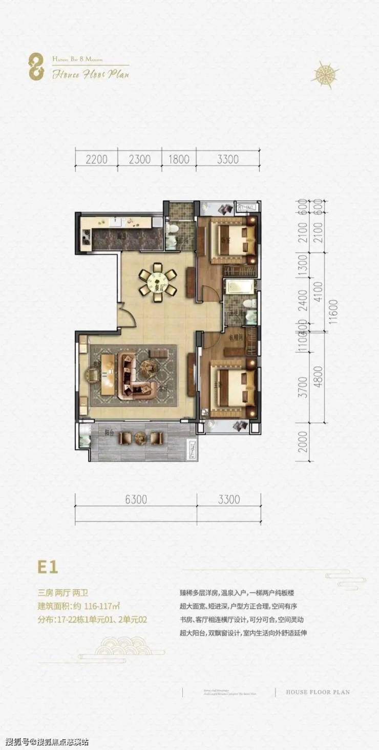 一梯两户板楼,客厅开间6.3m,总高6层,温泉入户低密度舒适型2+1房户型