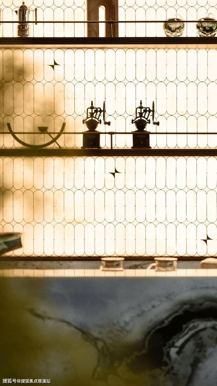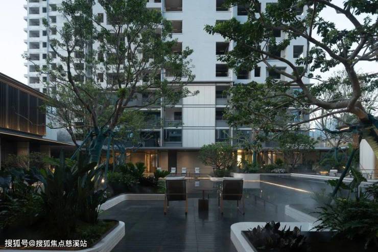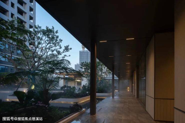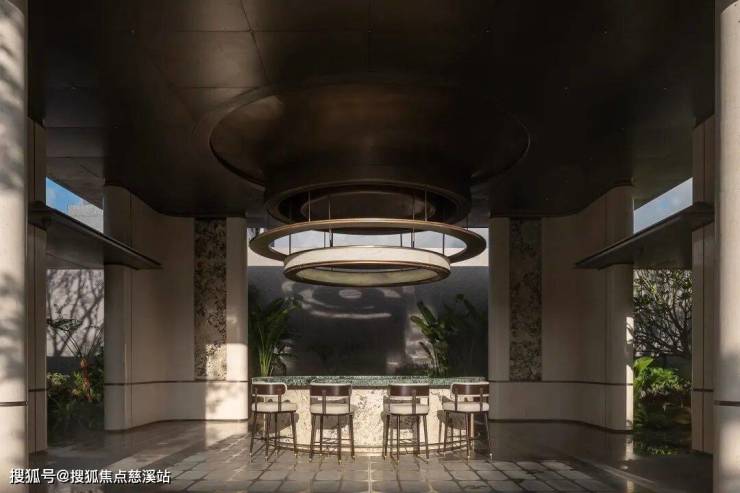 穿过大堂,步入园林,一场沉浸式的松弛度假之旅正式展开。约147米风雨连廊,24小时光幕温柔守护,晴雨皆成景致。动线串联400㎡下沉星光水院,叠级水景与龙鳞纹底板暗合“龙口衔财”吉祥寓意,潺潺流水声更似天然白噪音,轻抚心境。水院中的“星海岛屿”汲取新加坡W酒店设计灵感,与聆星会客厅无缝衔接,共同构筑社区中央的社交主场。