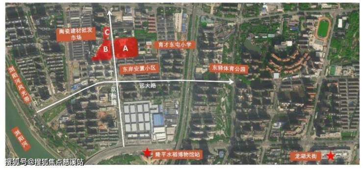 据航拍,地块实际由市政道路隔开的三块地组成(据图例分为A、B、C地块),综合来说,地块周边为建材市场、安置区、东屯小学,考虑货车装卸,市场往来人流嘈杂,整体城市界面较为一般。地块楼面价约5002元/㎡,相较于周边顶级教育配套湘郡培粹东校区的竞品中建九章赋5498元/㎡来说并不便宜,这也就意味着对中交产品力及价格有很大的挑战,才能抵消掉中建教育的优势。