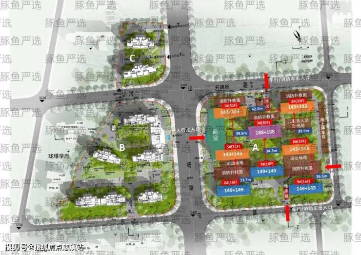 3、物业用房集中设置在A地块,社区用房设置在A、B地块,垃圾站设置在B地块。后期B、C地块业主需要去A地块办理物业相关事项,不是特别方便;